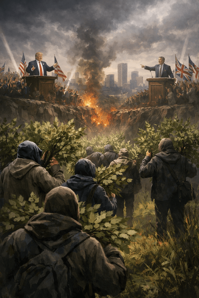Now widen the stage. Trump and Farage are not “witches.” They are characters born of a climate — figures who thrive where societies split into only two colours: loyal and traitor, pure and polluted, saved and damned. They are not the whole storm; they are barometers that people mistake for weather.