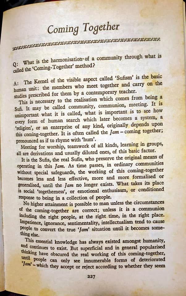 Shah writes that every form of human search which later becomes a system, a religion, or an enterprise of any kind originally depends upon this coming together. He says that it is often called the Jam, the coming together, and he is explicit that as time passes, in ordinary communities without special safeguards, the working of this coming together becomes less and less effective, more and more formalised or generalised, until the Jam no longer exists. That sentence is of extraordinary importance. It does not merely describe historical decline. It describes a law. The outer form may continue while the inner function has gone.