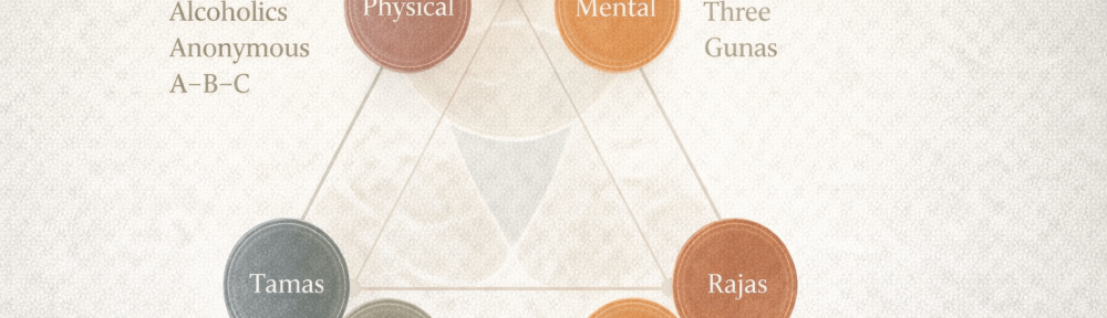 The Three Gunas, articulated with particular clarity in the Bhagavad Gītā (Chapter 14), describe dynamic tendencies within embodied life rather than moral verdicts. Sattva names clarity, harmony, and luminosity. Rajas names drive, restless motion, passion, and appetite. Tamas names inertia, heaviness, obscuration, and collapse. The Gunas are always interwoven; health is not the elimination of Rajas or Tamas, but balance under right governance. When Rajas dominates, agitation and craving intensify. When Tamas dominates, denial, paralysis, and despair thicken. When Sattva governs, discernment returns and proportion is restored. In lived addiction, the oscillation between restless drive and exhausted collapse is familiar: a Rajasic–Tamasic loop, with Sattvic clarity no longer governing the whole.