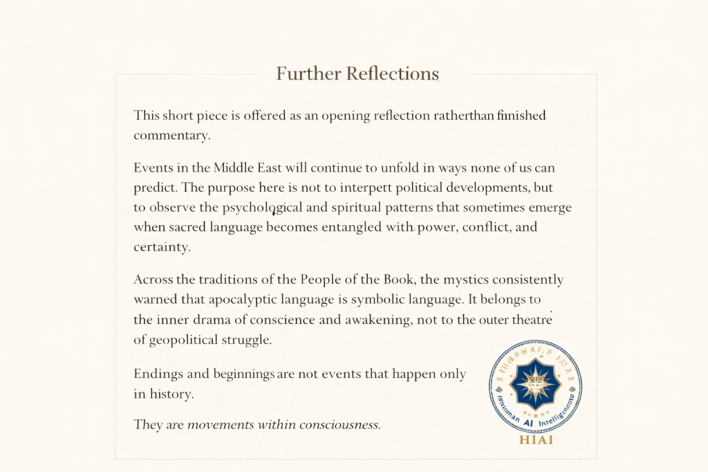 Across the traditions of the People of the Book, the mystics consistently warned that apocalyptic language is symbolic language. It belongs to the inner drama of conscience and awakening, not to the outer theatre of geopolitical struggle.